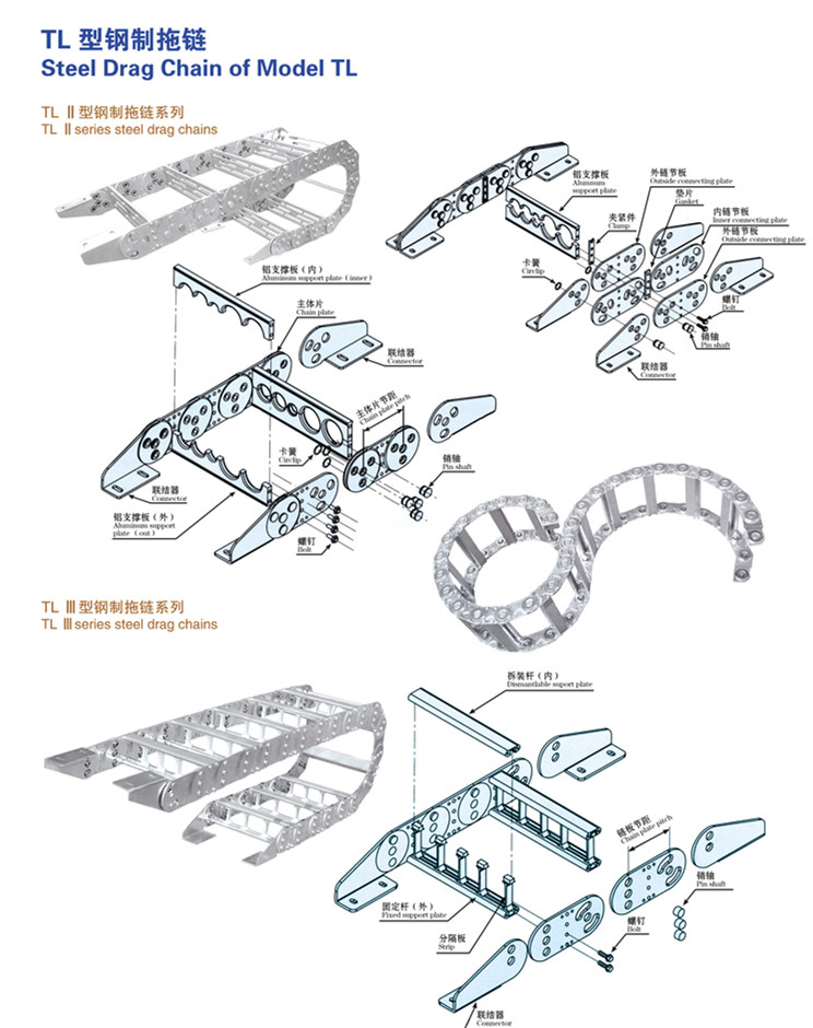 由鏈板(優(yōu)質(zhì)鋼板鍍鋅)支撐板(擠拉鋁合金)軸銷(合金鋼)等部件組成,使電纜或橡膠管與拖鏈之間不產(chǎn)生相對運動,不產(chǎn)生扭曲變形,鋼性能好不變形,安裝方便,使用可靠,易拆裝 ,尤其是鋼制拖鏈采用了高強度耐磨材料,合金鋼為軸銷,提高了產(chǎn)品的耐磨強度,彎曲更靈活,阻力更小,降低了噪音,從而可保證長時間運行下不變形。