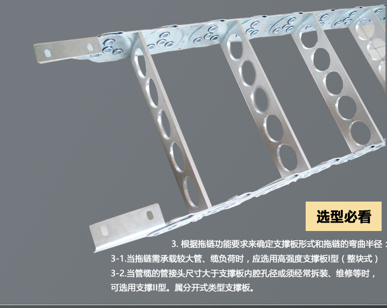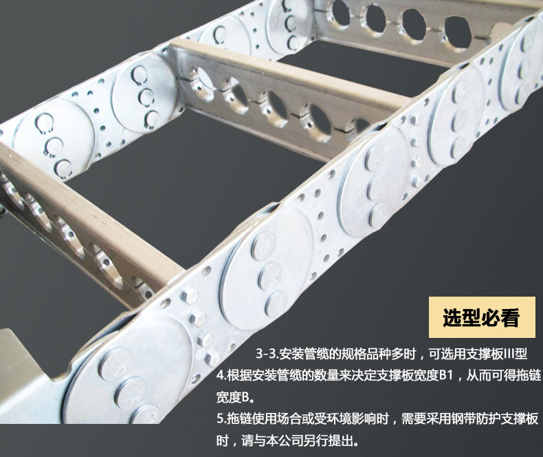 (1)當拖鏈需承載較大管、纜負荷時,應選用高強度支撐板Ⅰ型(整塊式)。
