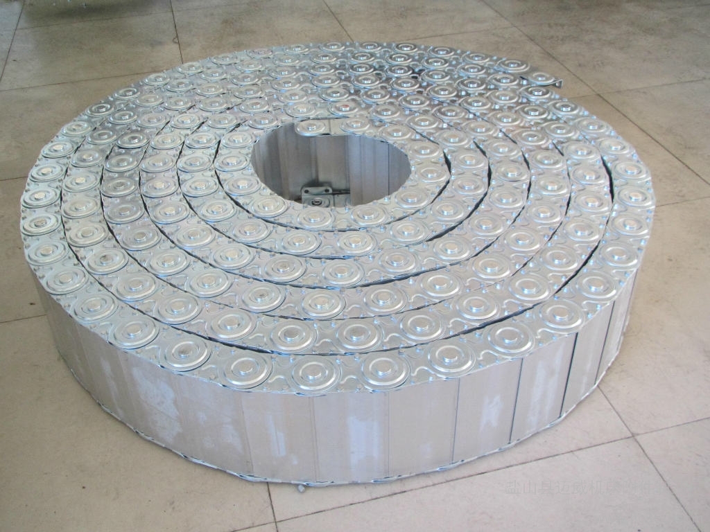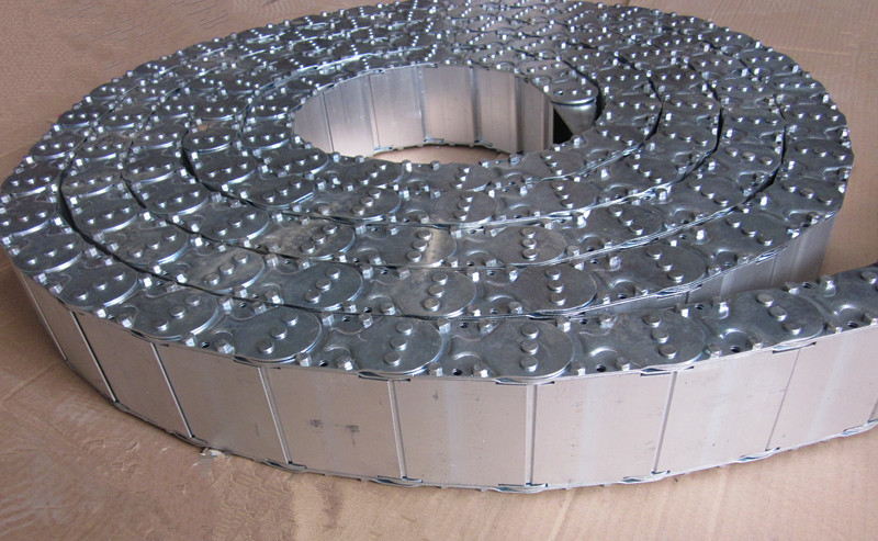 鋼鋁拖鏈的主體是由鏈板(采用優質鋼板經淬火后再拋光鍍鉻/鍍鋅/噴塑處理)、支撐板(擠拉鋁合金)、軸銷(合金鋼)等部件組成.使電纜或橡膠管與拖鏈之間不產生扭曲變形,鏈板經鍍鉻處理外形效果新穎,結構合理,靈巧強度高,該產品鋼性好,不變形.安裝方便,使用可靠,易拆裝,不下垂.由于本產品外形精美,可在較大程度上增強機床設備的整體藝術美觀效果,增強我國機床,機械設備在國際市場的競爭能力。