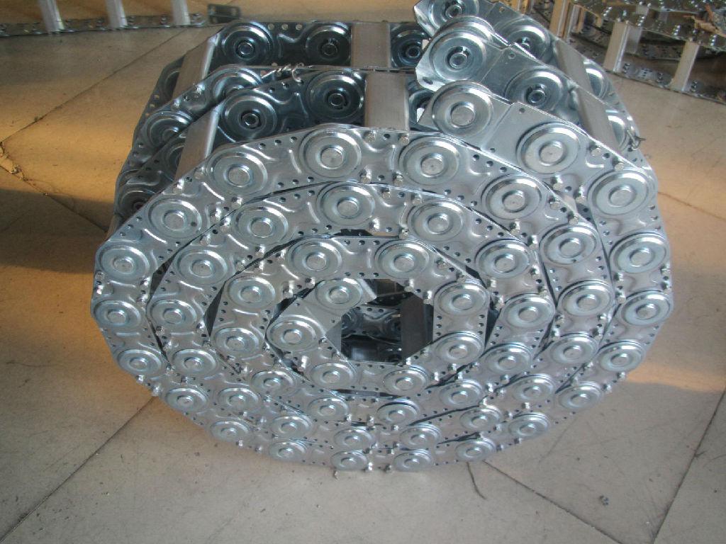 適用于所有傳動方式.可隨意加長和縮短.TLG型鋼制拖鏈可承載數量多,重量大的電纜及油管,自由懸置長度大,支撐板可依顧客需要制作,使用于工作母機,移動機械等.此外,可通過改變銷軸獲得改變彎曲半徑。