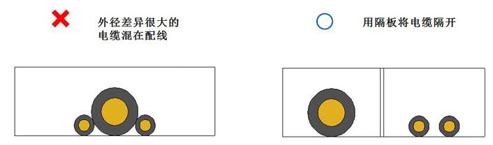 外徑差異很大的電纜如果混在配線,容易導(dǎo)致細(xì)線被粗線壓迫,造成細(xì)線容易斷線。這時(shí)需要用隔板將不同直徑大小的電纜隔開(kāi)。