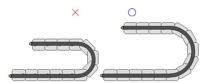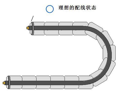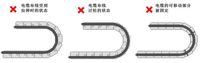 另外,電纜的移動(dòng)部分如果被固定,會(huì)導(dǎo)致彎曲應(yīng)力無(wú)法被分散及吸收,會(huì)在固定位置造成應(yīng)力集中。電纜的固定部位應(yīng)設(shè)置在拖鏈的兩端。